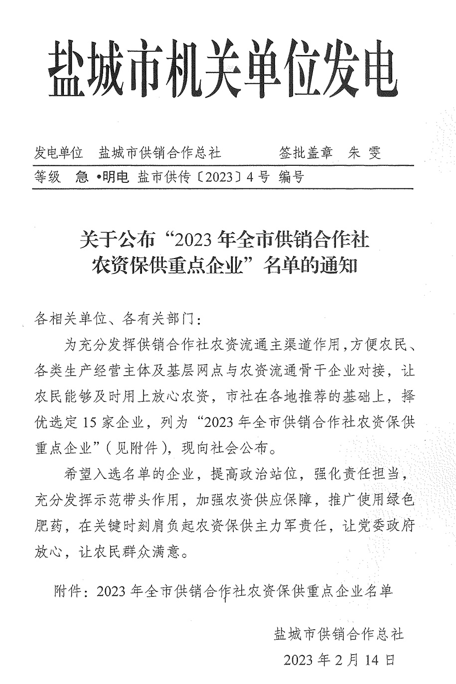 关于公布“2023年全市供销合作社农资保供重点企业”名单的通知
